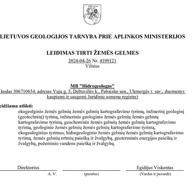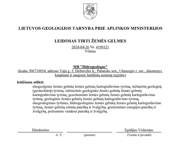 MB „Hidrogeologas“ turi Lietuvos geologijos tarnybos prie Aplinkos Ministerijos išduotą leidimą tirti žemės gelmes.